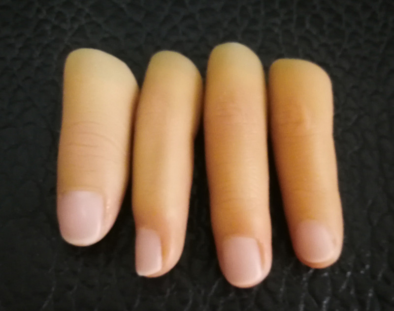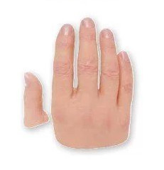 用于手指截肢的裝飾性假指。由橡膠、皮革、樹脂、硅橡膠等制作。形式多樣,起彌補(bǔ)手部外形的作用。單指截肢可以佩戴指套,多指截肢時(shí),相應(yīng)做成內(nèi)手套的形式。