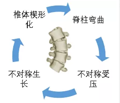 研究表明,椎體的楔形化是脊柱側彎的開始。起初,楔形化不明顯,但在不平衡的力學作用下,椎體兩側的生長不再一致,脊柱凹側由于受壓較大,生長變慢,而凸側受壓小,生長快,導致椎體楔形越來越嚴重,形成惡性循環(huán)。正是因為側彎這種發(fā)展機制,我們建議要早發(fā)現早干預,阻斷惡性循環(huán)鏈條。