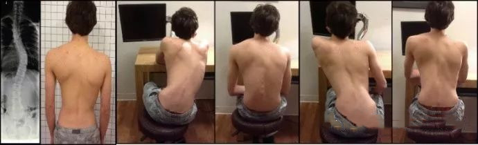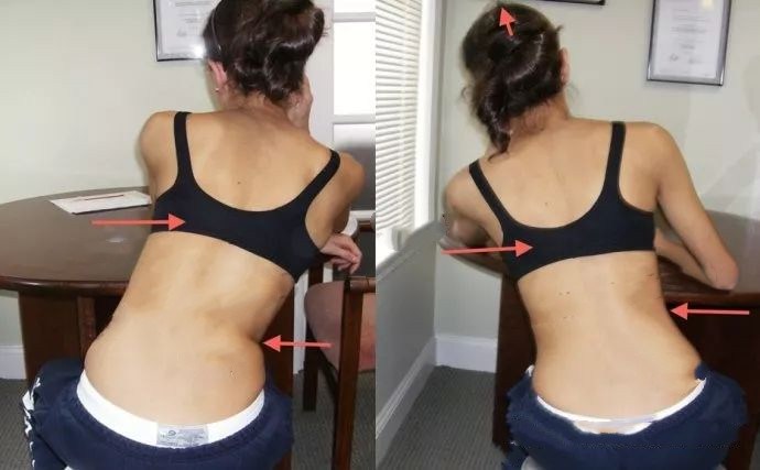 如何在日常生活中,減少側(cè)彎進(jìn)展的風(fēng)險(xiǎn),坐、立、行走的姿勢(shì)就非常重要。如下圖。同一個(gè)患者在不同姿勢(shì)下,脊柱側(cè)彎表現(xiàn)差別很大。用左側(cè)的姿態(tài),側(cè)彎進(jìn)展風(fēng)險(xiǎn)變高。用右側(cè)姿態(tài),側(cè)彎得到控制。