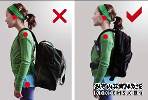調(diào)整書包的位置,讓書包位于腰部。肩帶也不能太寬,至少不要超過孩子走路擺手時的寬度,即書包不能阻擋孩子擺手,因為孩子走路時,雙手的擺動能幫助身體平衡,當(dāng)孩子的雙手不能擺動,就會導(dǎo)致身體搖晃。