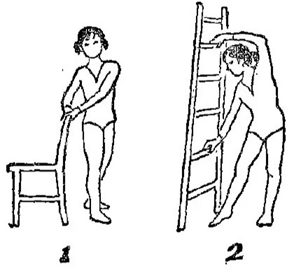2、雙手扶肋木或梯子,向右頂著脊柱突出部側(cè)屈;
