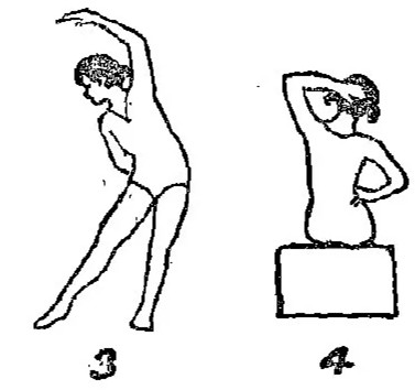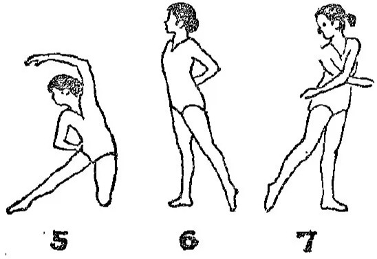 3、右手置腰后,左手舉過(guò)頭頂,向右側(cè)屈;