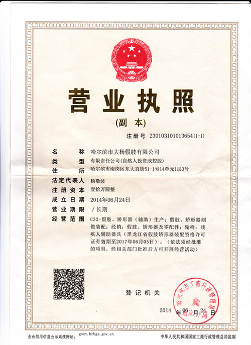 哈爾濱市假肢矯形器裝配資格許可證